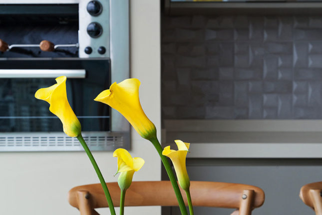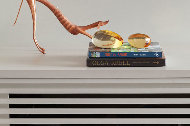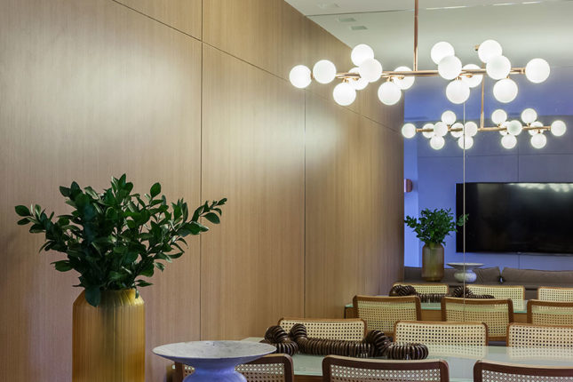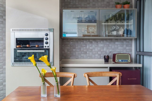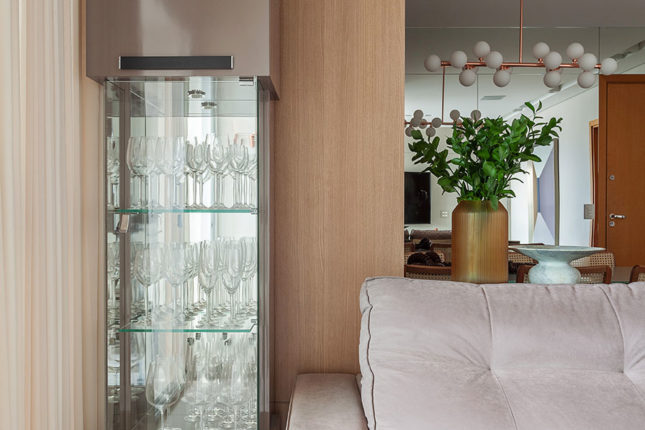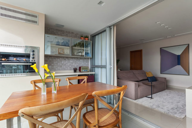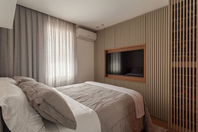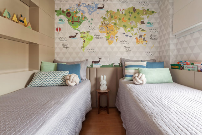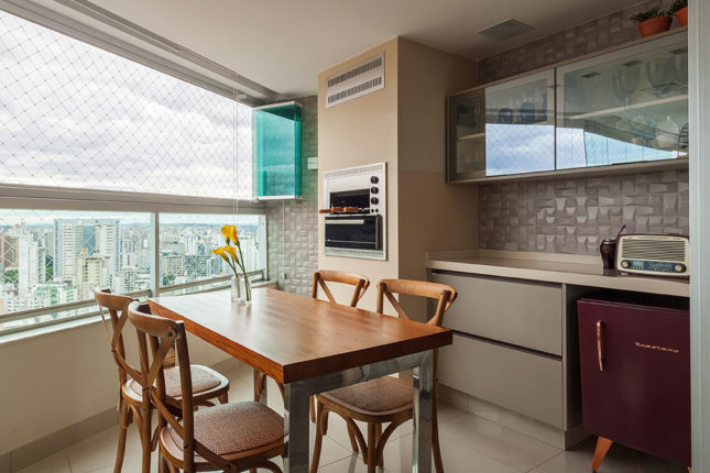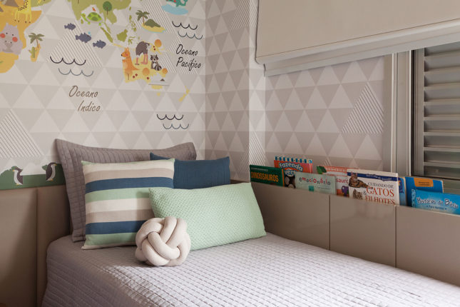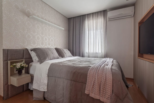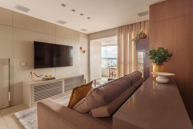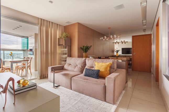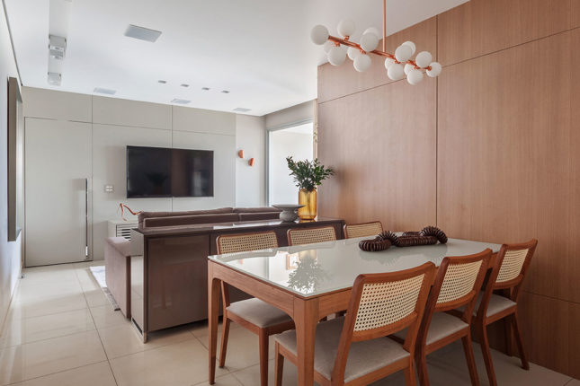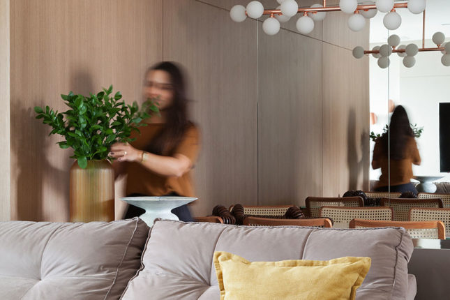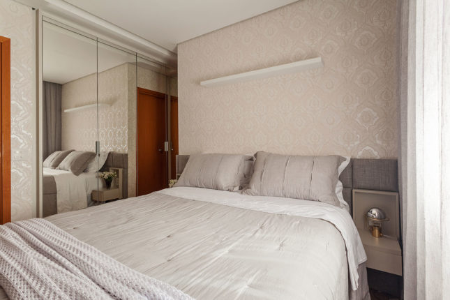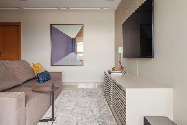 Com 105 m2 e três quartos, este apartamento possui varanda integrada à sala, que também assume a função de home. No quarto de casal, espelhos foram usados estrategicamente para conferir a sensação de amplitude, enquanto no quarto das crianças é a marcenaria feita sob medida que otimiza o espaço.