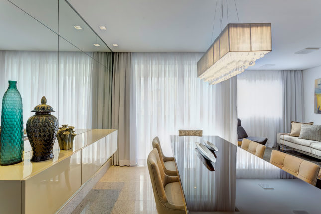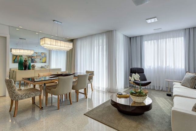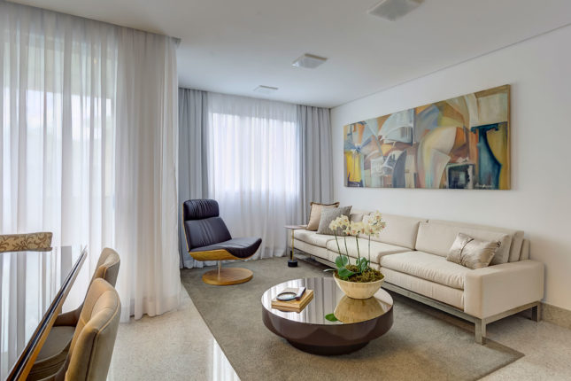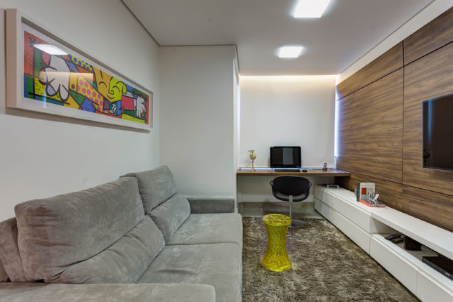 Para um casal jovem sem filhos, este apartamento de 110 m2 teve um de seus quatro quartos transformado em sala de TV. A decoração possui cartela de cores em tons neutros e nos móveis é o estilo clássico que predomina.