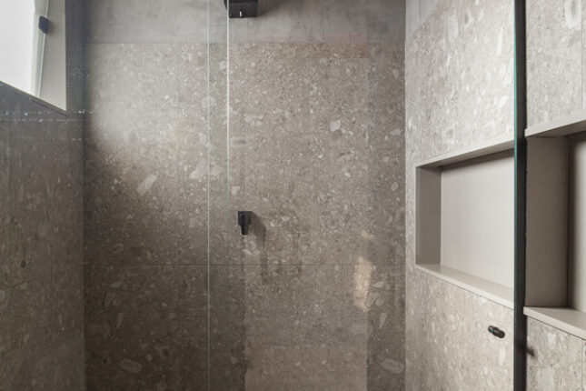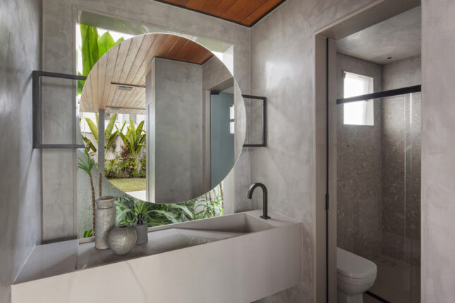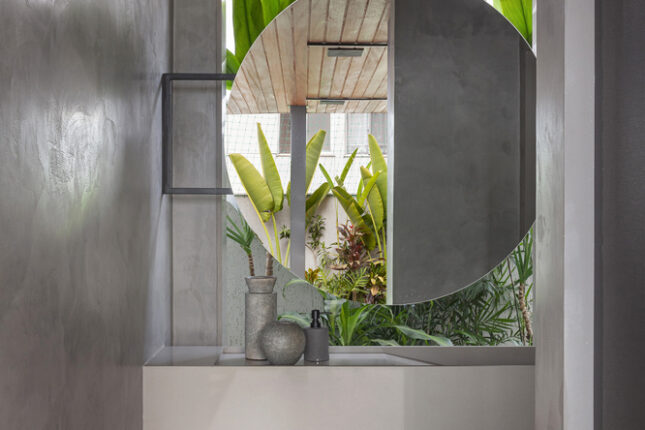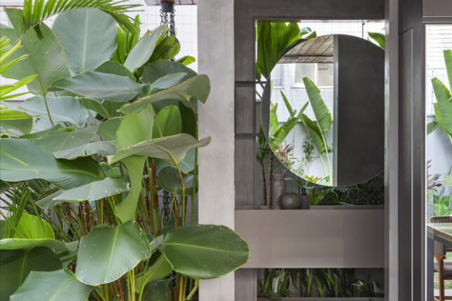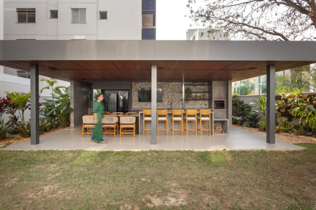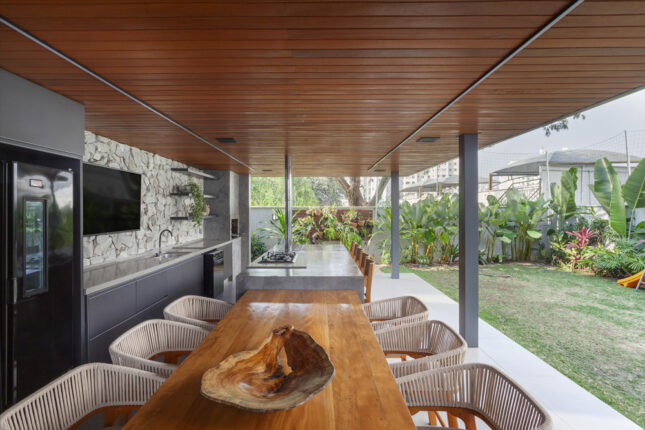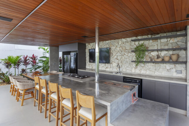Projetado com um sistema estrutural de pilares e vigas metálicos, o ambiente apresenta uma base neutra em tons de cinza, que aparecem na estrutura, no piso, nas bancadas e na marcenaria. A grande ilha central é o coração do projeto, reunindo um fogão à lenha, um cooktop e até uma mesa integrada, onde todos se conectam.
