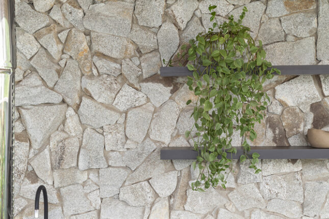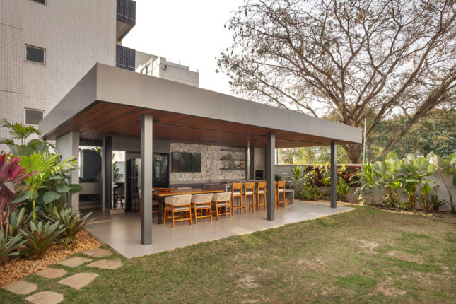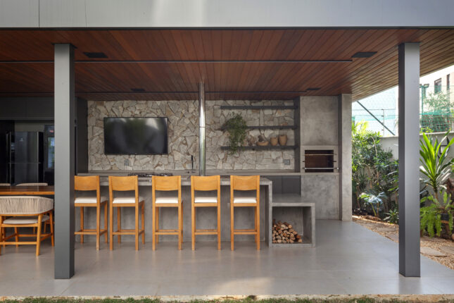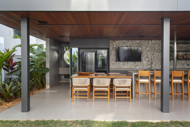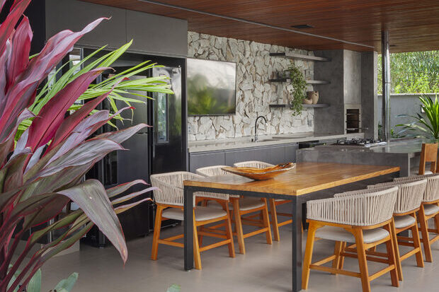 Materiais naturais, como a pedra que reveste a parede de fundo e a madeira no forro, trazem um toque de aconchego. Um verdadeiro mix de modernidade e rusticidade, pensado para os momentos de descontração!