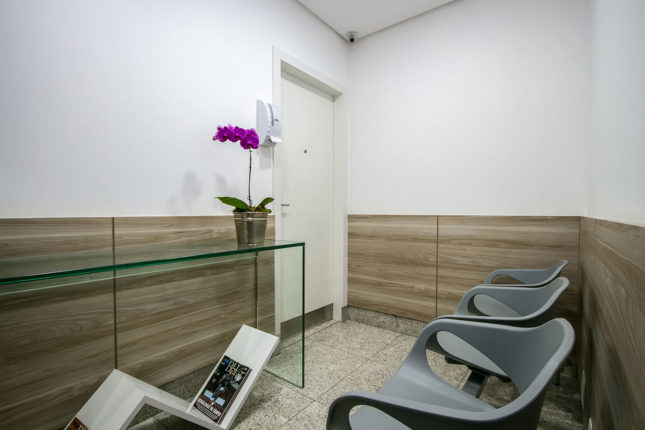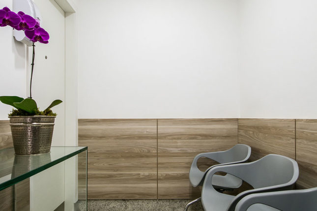 A recepção ganhou revisteiro desenhado exclusivamente pelo escritório e um painel de madeira aplicado à meia altura da parede foi responsável por conferir acolhimento ao espaço. Na área de atendimento, uma televisão instalada no teto deixa os pacientes mais à vontade.