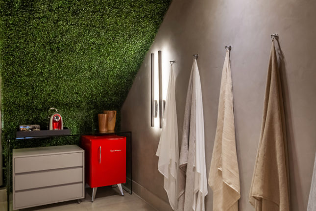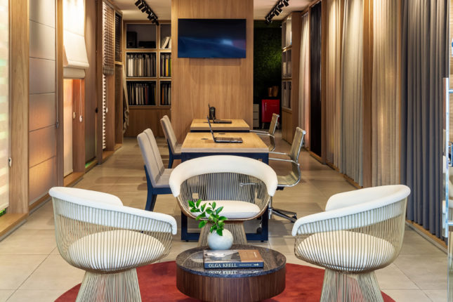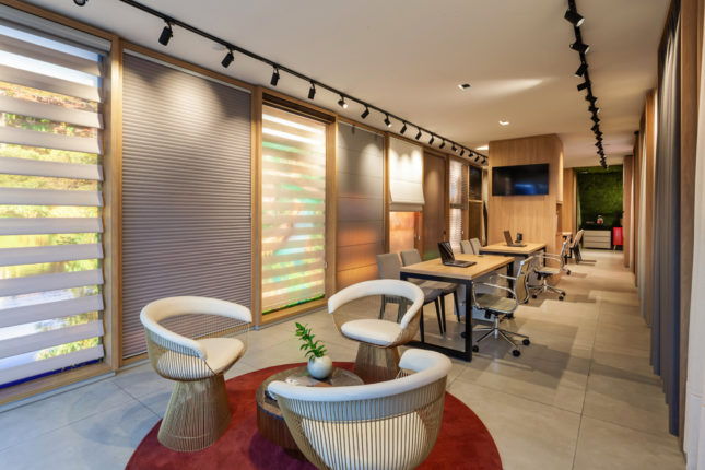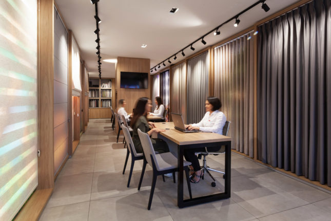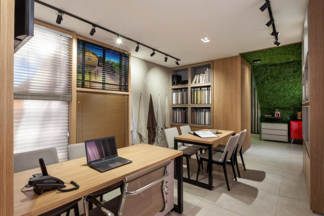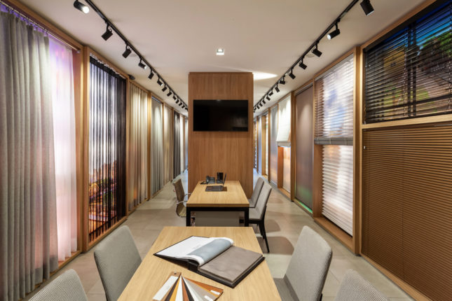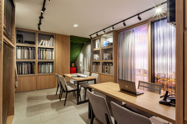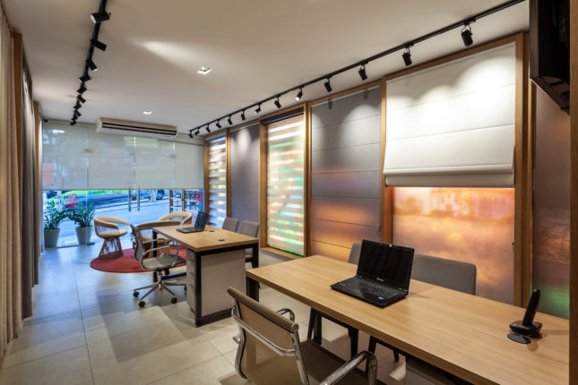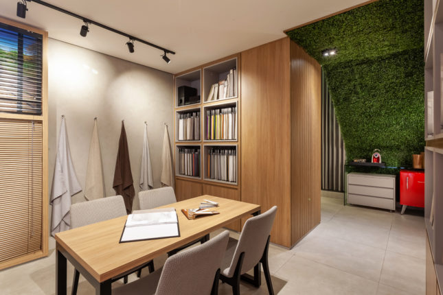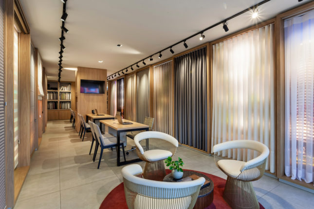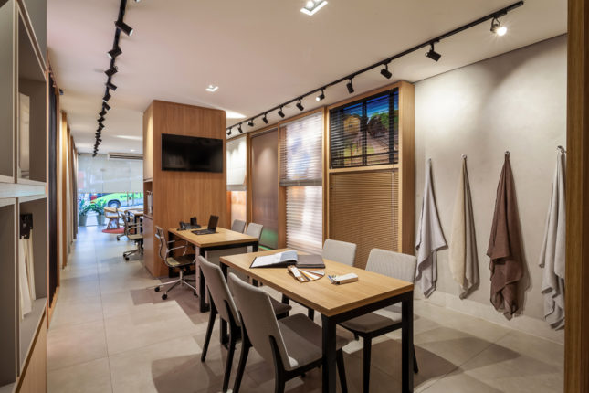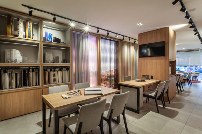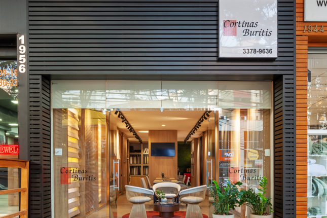 Loja de 67m² do segmento de cortinas que passou por uma grande transformação do seu showroom. Fachada com ripas em alumínio transmitindo um design mais limpo e moderno. Interior da loja sendo totalmente repaginado para expor melhor todas as amostras, e uma iluminação estratégica com intuito de destacar os diversos modelos de cortinas.
