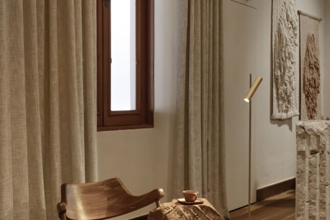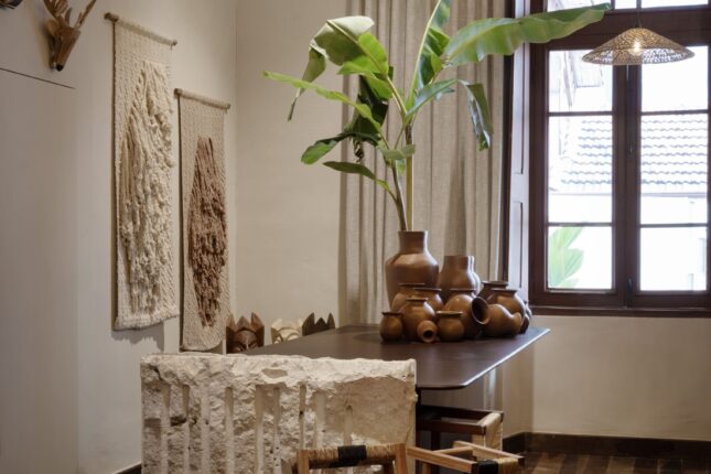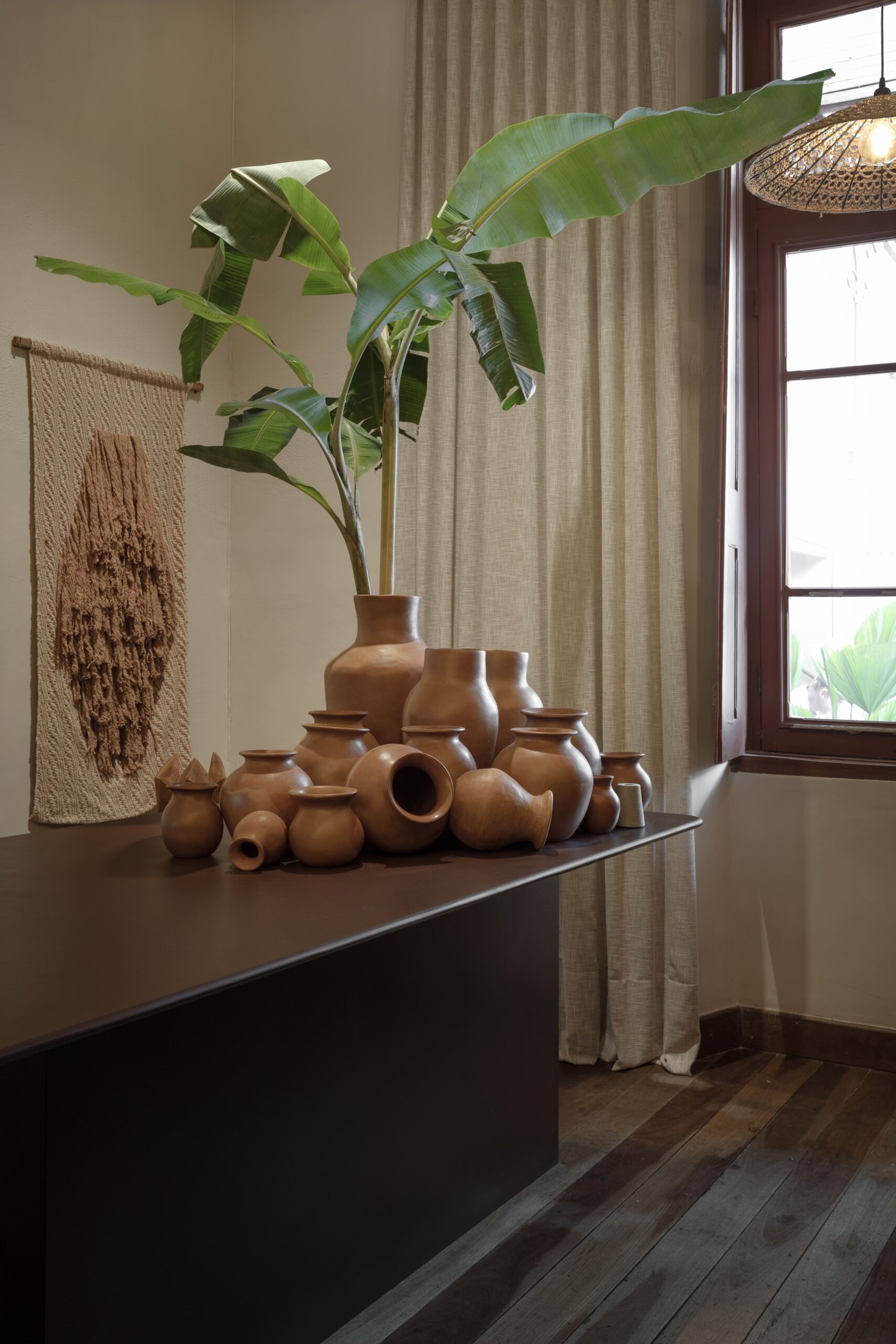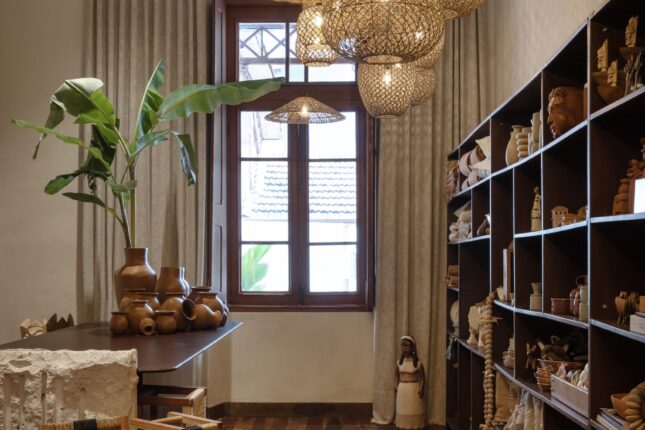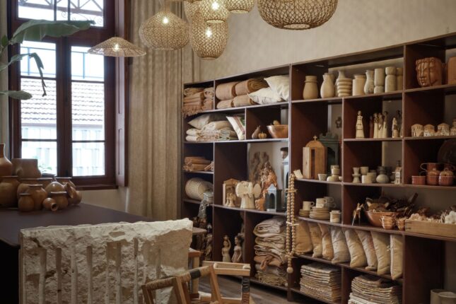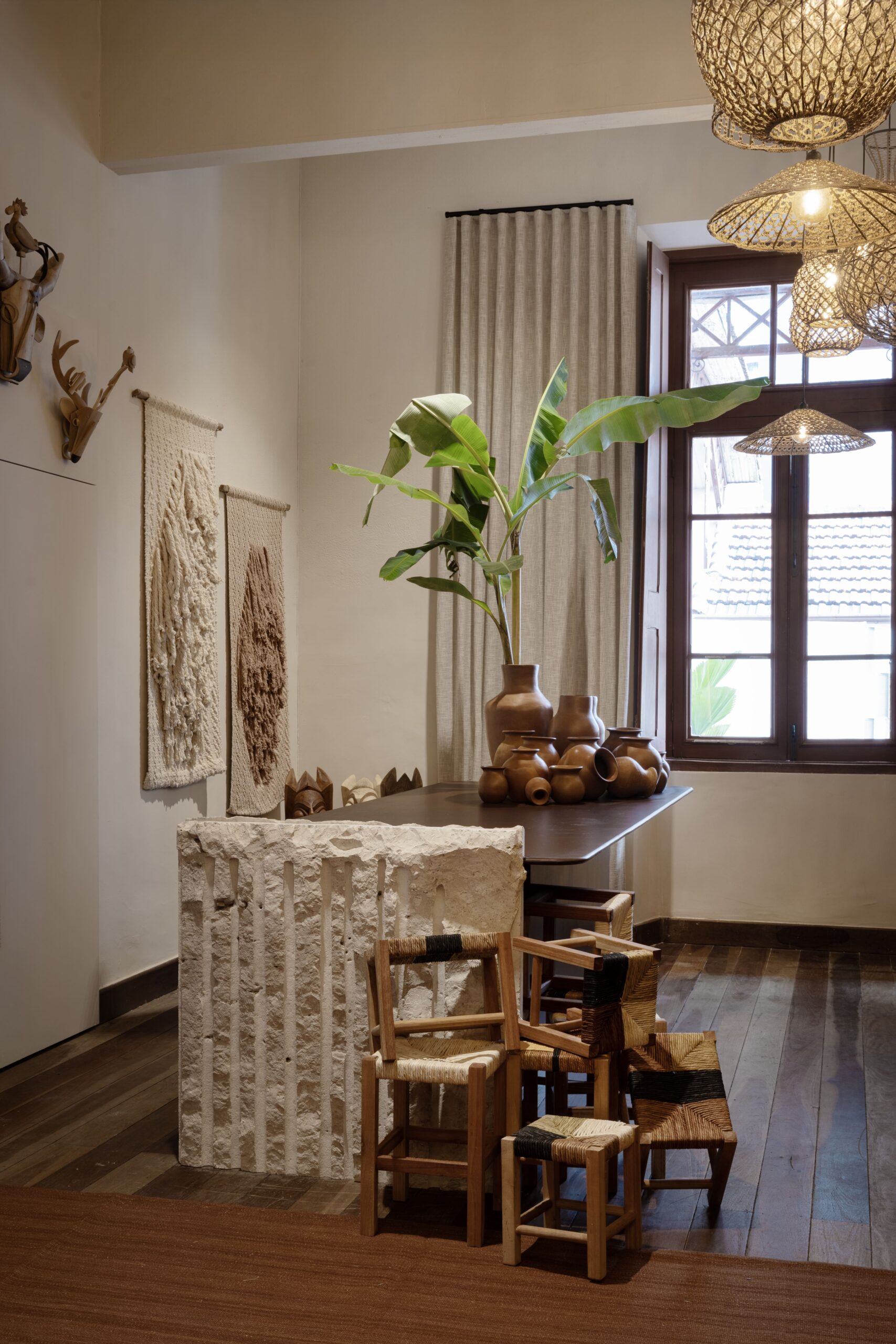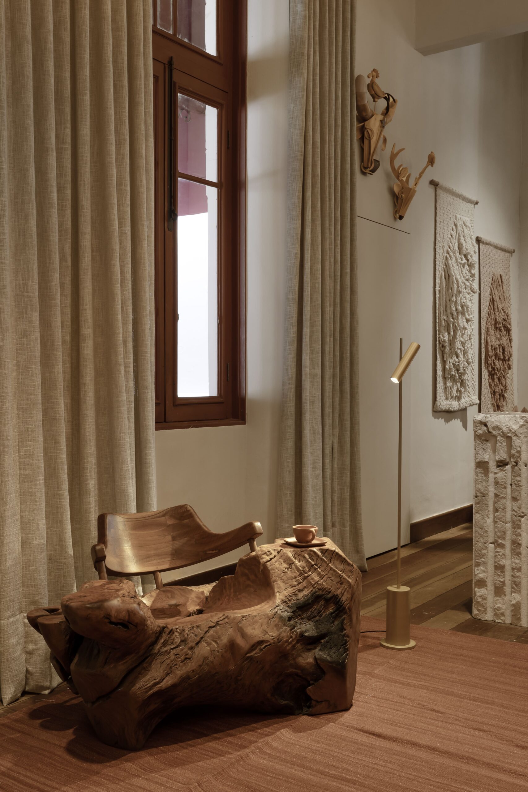 Tudo aqui inspira: as peças à venda, o mobiliário único, os elementos brutos como a pedra natural, e a paleta de tons quentes e terrosos — todos integrados com respeito à arquitetura da Escola Estadual Afonso Pena, que nos acolhe.