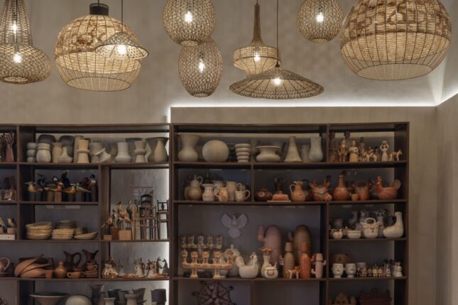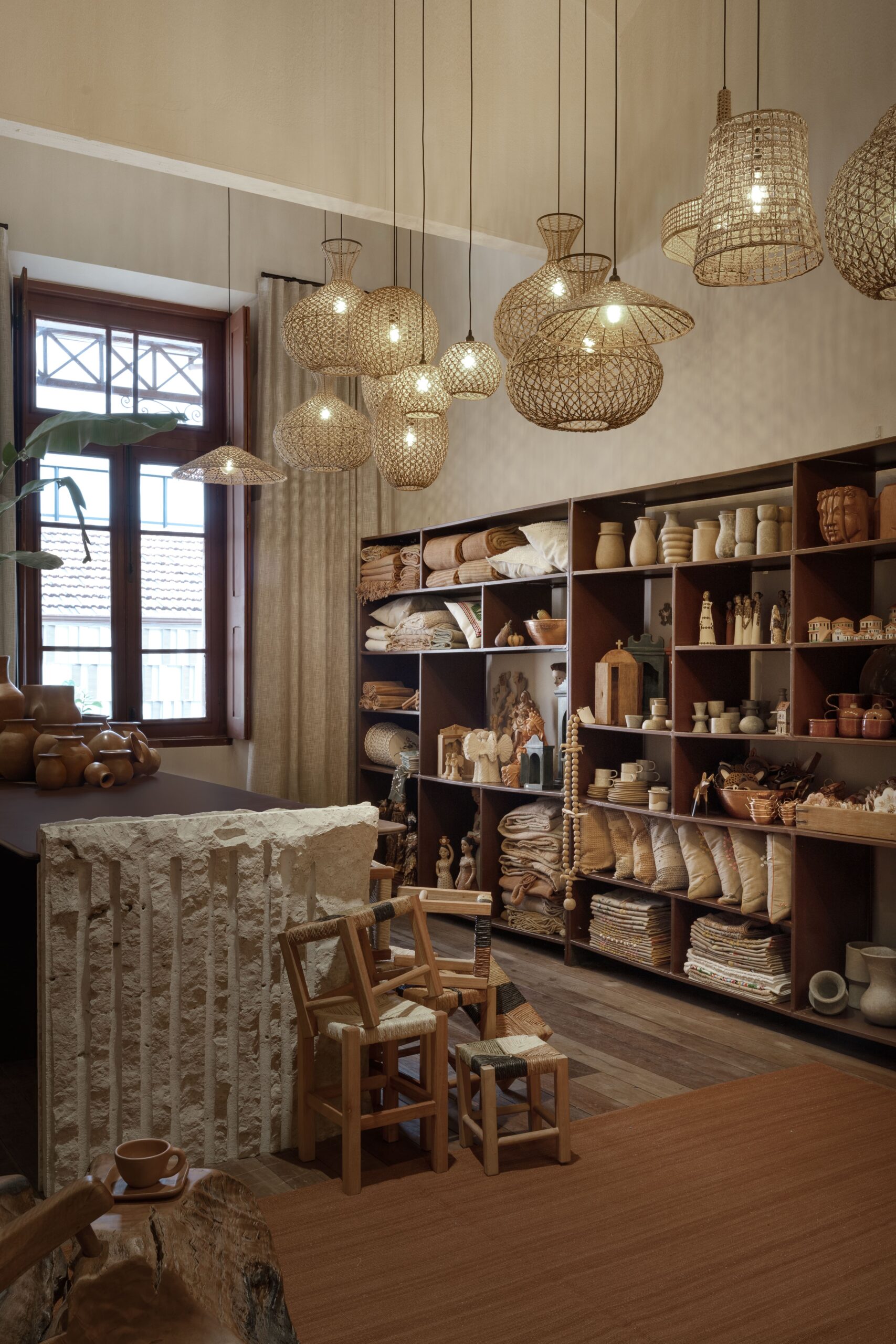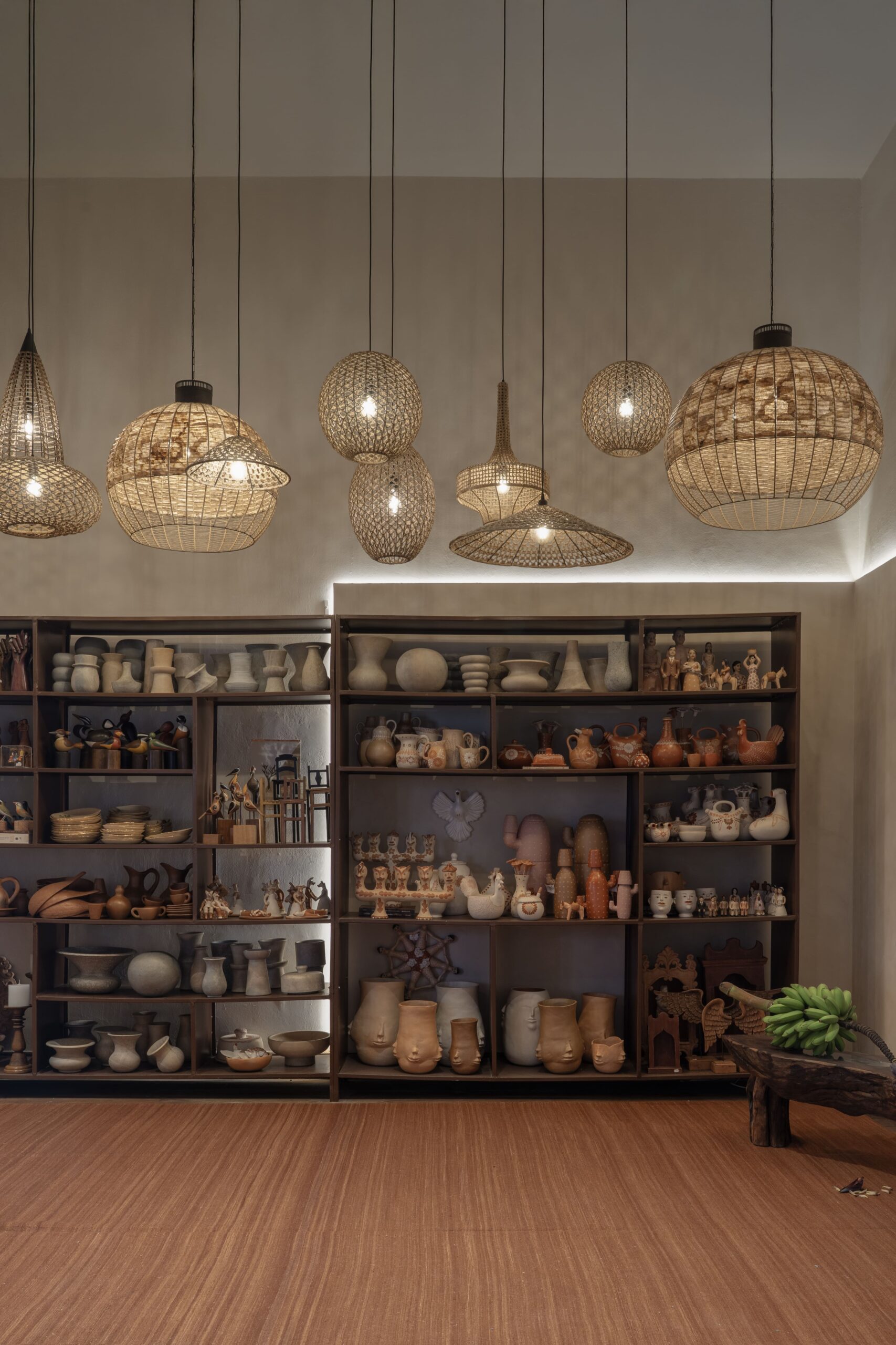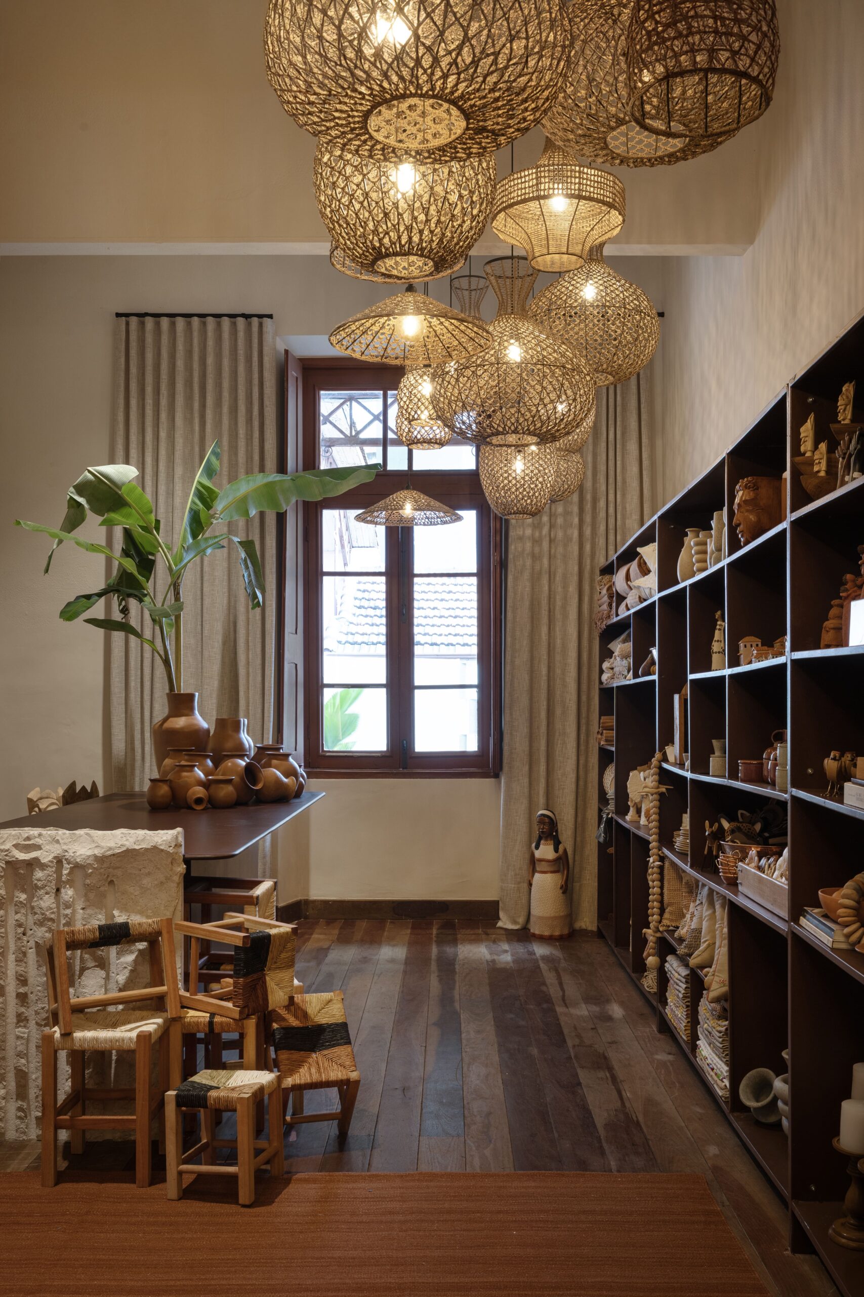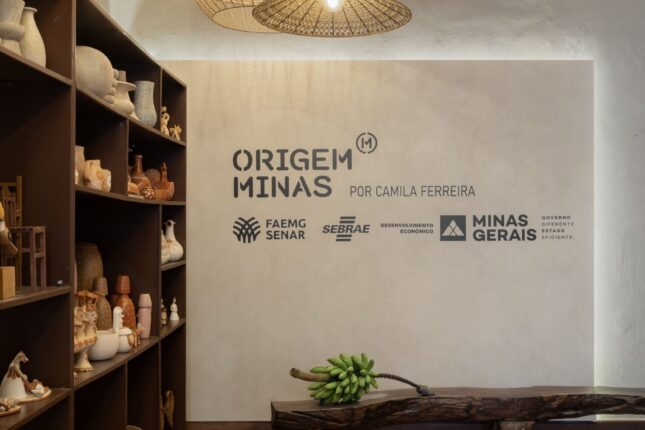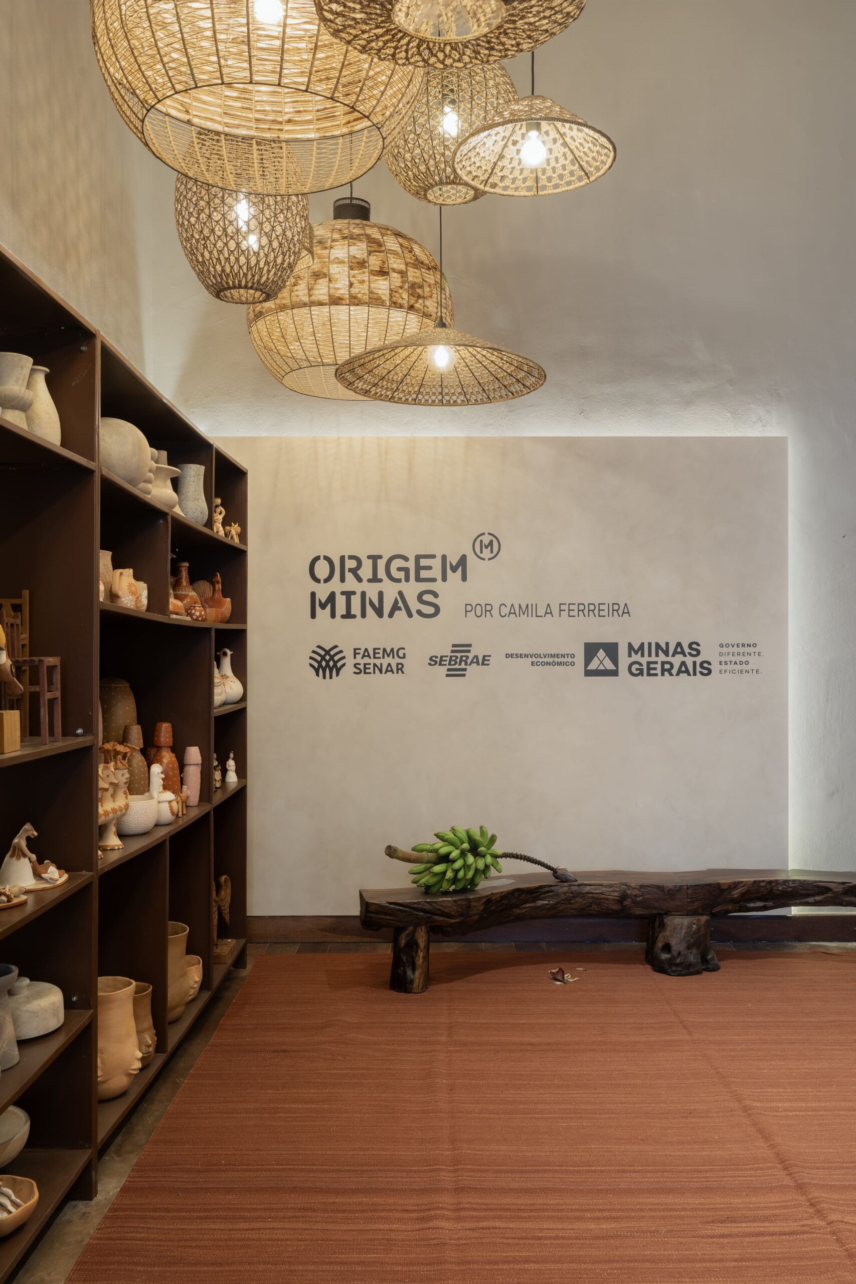Em um gesto longitudinal, uma estante expositora guia o olhar, acompanhada por um maciço de luminárias criadas por artesãos mineiros, iluminando o percurso com originalidade e poesia.