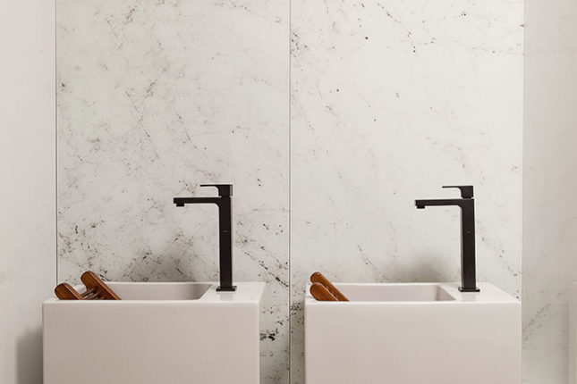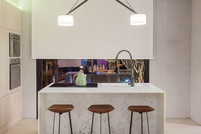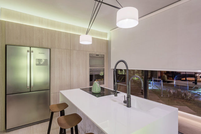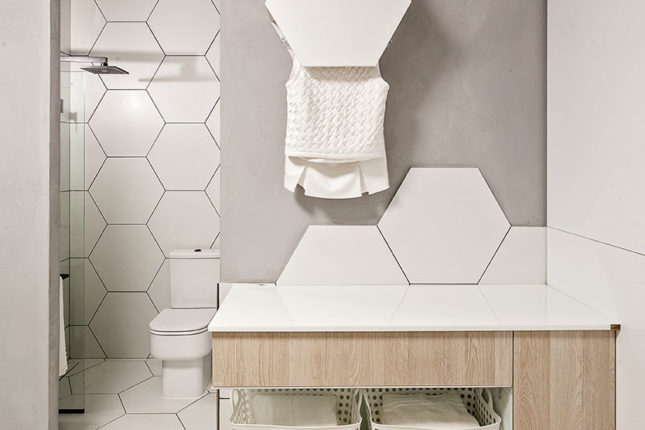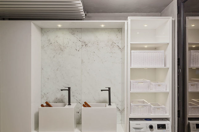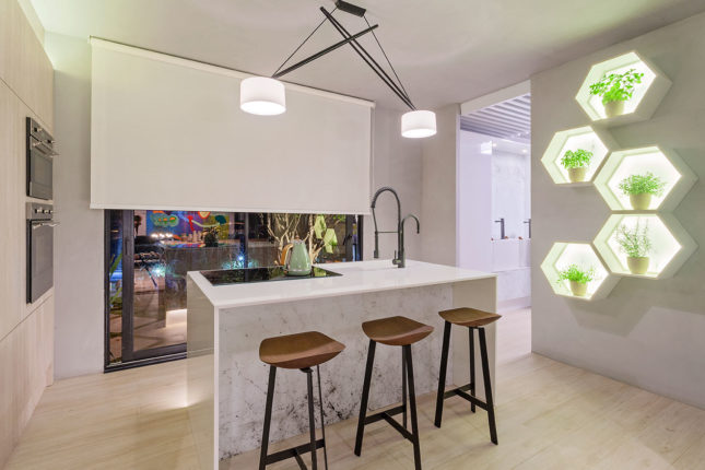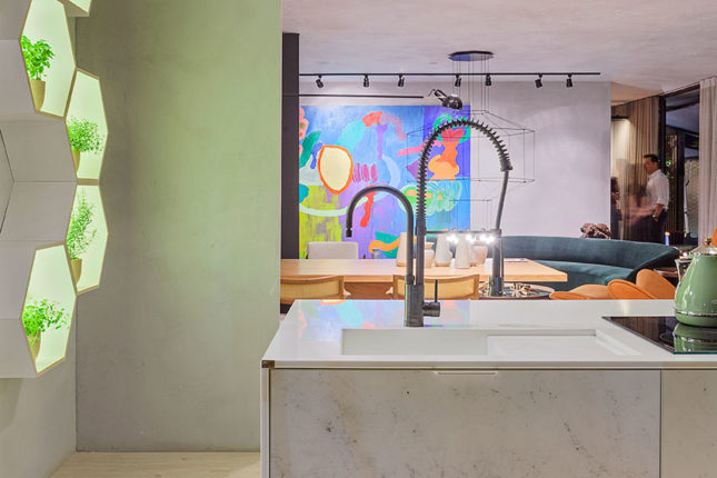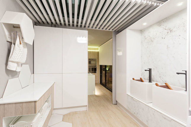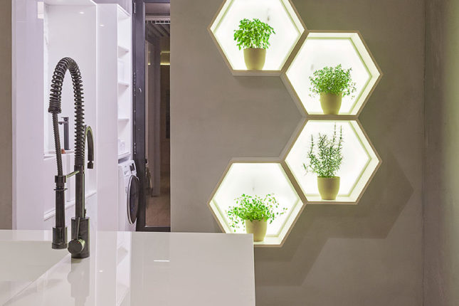 O ambiente engloba também banho e área de serviço. Além da bancada em Nanoprime, chama atenção a sua cartela de cores, toda em tons mais claros e suaves e “nichos luminárias” pensados para abrigar uma pequena horta.