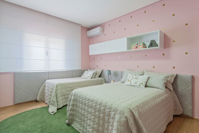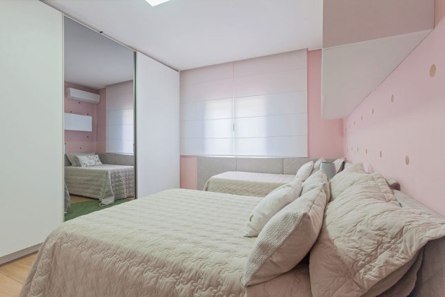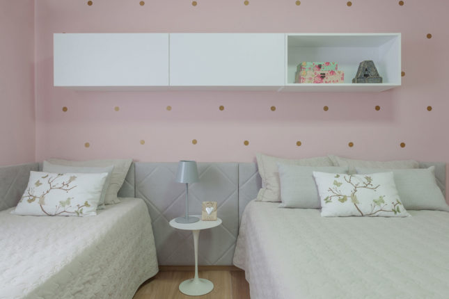 Dividido por mãe e filha, este quarto explora a feminilidade das mais variadas formas para atender a duas faixas etárias distintas. O papel de parede rosa ganhou adesivo com bolinhas douradas no estilo faça você mesmo, e ficou responsável pela pegada jovem, enquanto cabeceira e estante de nicho com design de linhas retas conferem a atemporalidade que o espaço merece.