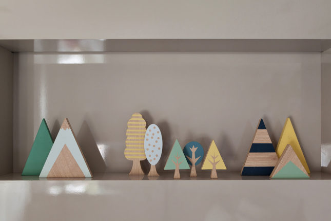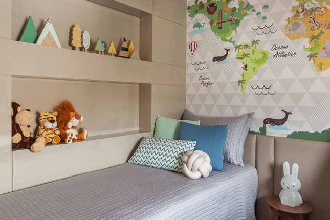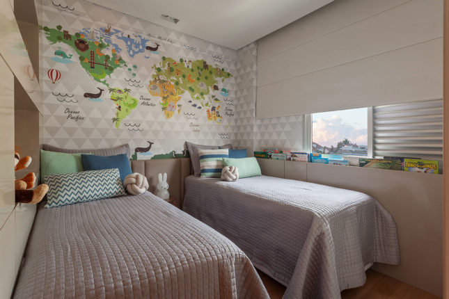 Um papel de parede com o mapa mundial que aborda a fauna e a flora se encarregam de conferir o tom lúdico e bem humorado deste quarto. Para otimizar o espaço, uma marcenaria feita sob medida nas laterais das camas guarda os objetos e livros dos irmãos.