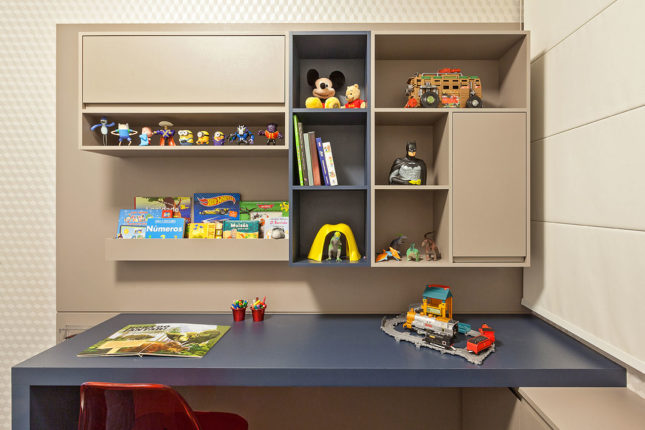 Um quarto que também deve receber espaço para os estudos. Neste projeto, estantes e bancadas feitas sob medida se transformaram em um espaço propício para estudar. A cama junto à parede também assume o papel de sofá e é ideal para juntar os amigos nos dias de festa.