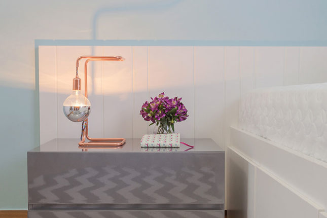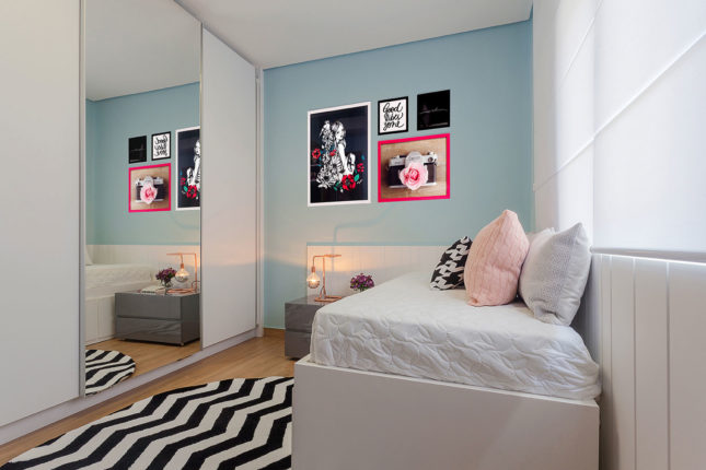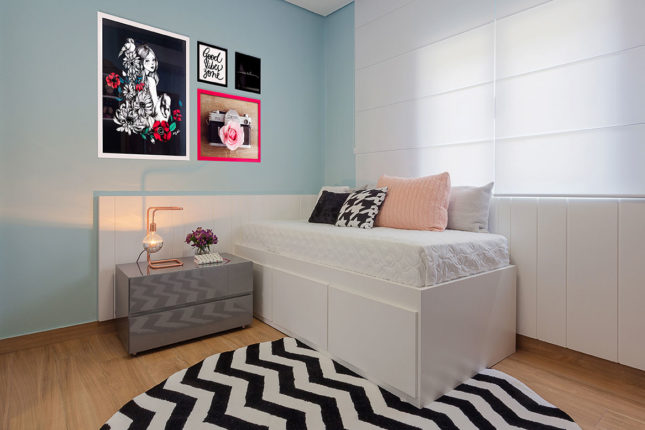 Pensado para uma adolescente, este quarto possui base em tons pastel, cama com gaveteiros e um painel que também assume o papel de cabeceira. Para garantir a versatilidade, almofadas e tapete estampados deixam o quarto mais jovem e permitem que a adolescente mude a decoração com uma simples troca de capas de almofadas.